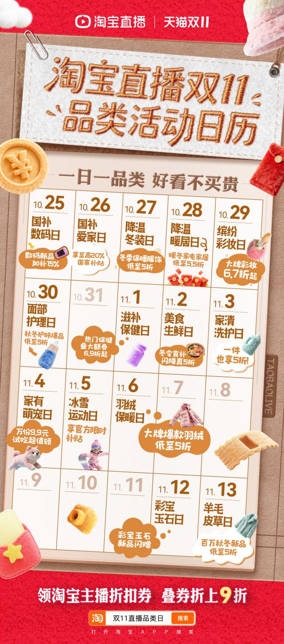 今年双11正式进入热卖阶段,淘宝直播开启“特色品类日”活动。从10月25日至11月13日,推出“一日一品类”主题专场,围绕消费者秋冬生活场景,打造数码、美妆、家电、服饰、珠宝、美食、宠物等多个热门领域的直播活动,让消费者买得省心、看得尽兴。
