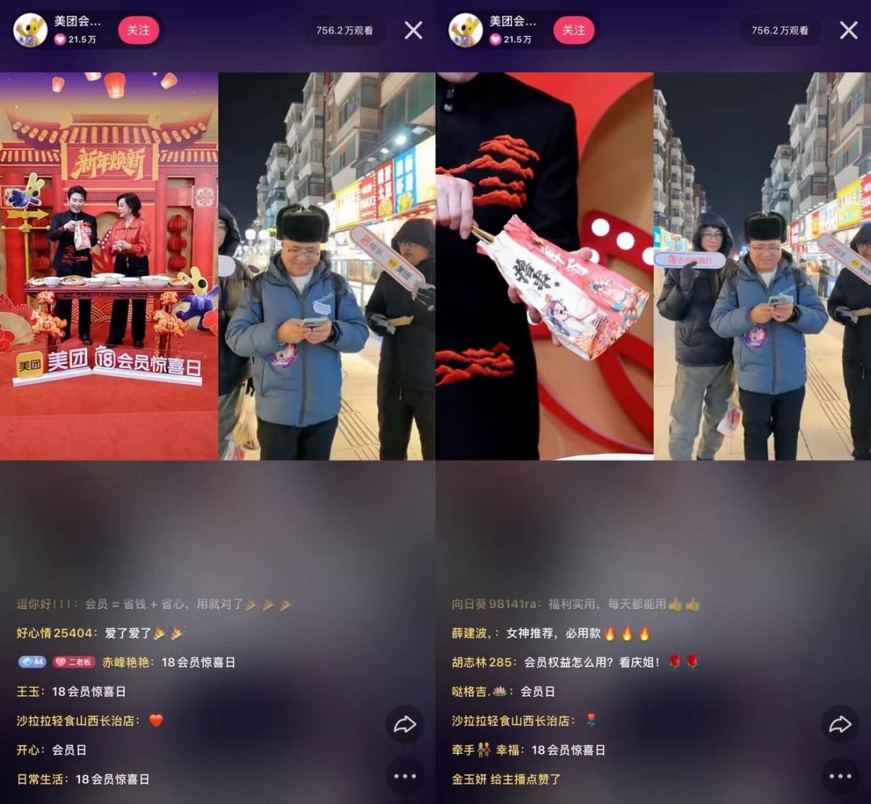 当连线切换到 @大洋是个好人,场景进一步从个人生活延展到城市烟火气。他带着观众云逛大东北最具代表性的长春桂林路夜市,在边逛边聊中,自然引出了“吃得好、送得快”的需求。随后,他现场用美团为刘晓庆点了一份东北特色蚕蛹,用实际操作展示美团外卖 1 对 1 急送的会员特权。整个过程不依赖任何口播解释,而是通过“下单—送达—体验”的完整链路,让用户直观看到权益如何解决真实场景中的即时需求。